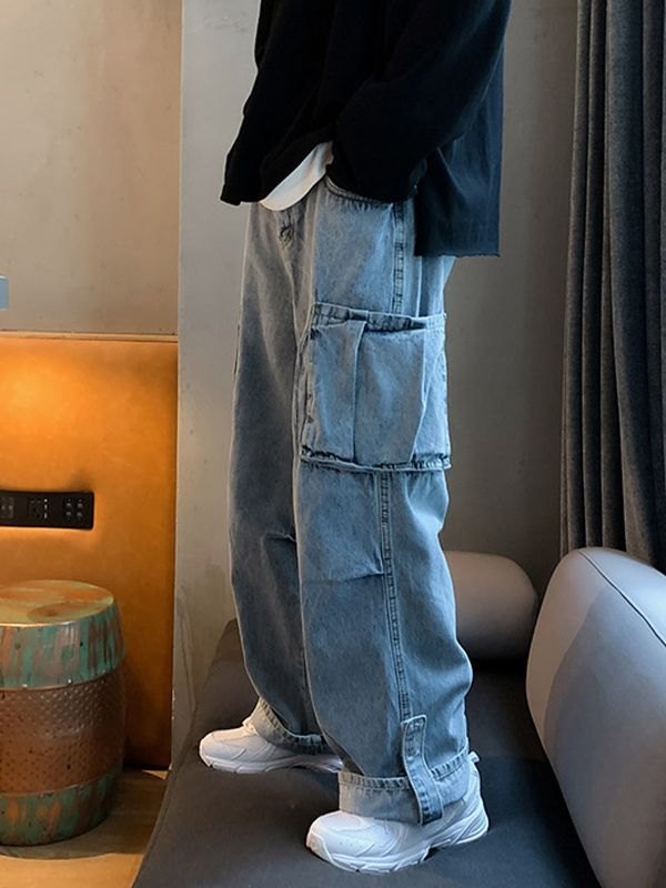 Design: This washed jeans shaped to a relaxed fit, with cargo pockets patched and a zip button fasten. Complete with velcro fasten at cuffs.